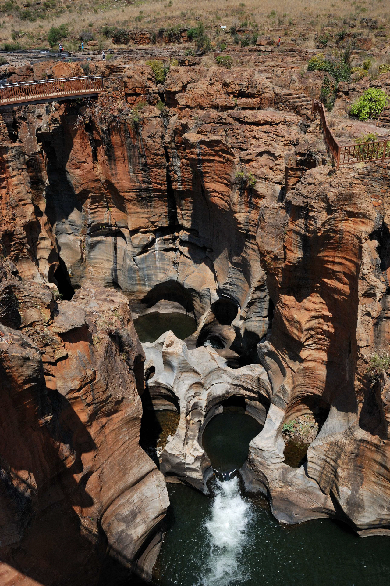 Wir kamen gegen 10:45 Uhr am Blyde River Canyon an und liefen zum Fluss. Dort bewunderten wir die Bourke's Luck Potholes, die der Fluss im Laufe der Jahrzehnte ausgespült hatte. Beim nächsten Aussichtspunkt genossen wir einen tollen Blick über den Canyon und die Drakensberge und später auf die 3 Rondavels. Das sind drei Berge, die jeweils einem Rundbungalow ähnlich sehen. Außerdem gibt es dort einen großen Stausee, der das umliegende Land mit Wasser versorgt. Leider war es ziemlich diesig, so dass wir uns nur mit bescheidenen Fotos zufrieden geben mussten.