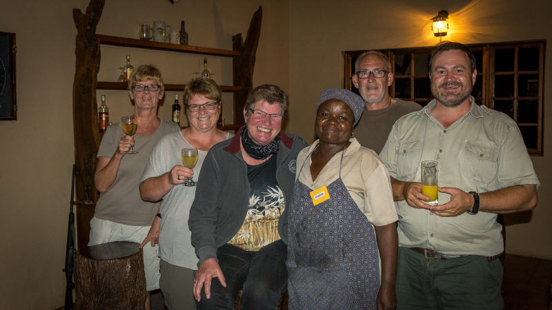 Da es immer wieder regnet, findet der Sundowner im Hatari-Camp statt, dort ist es überdacht und wir können im Trockenen unseren Sekt trinken. Wir haben eine Menge Fragen an Ralf und er beantwortet alle sehr gerne.