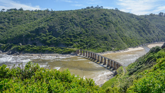 Kurz vor Wilderness befindet sich der Aussichtspunkt "Dolphin Point". Von hier aus hat man einen grandiosen Blick auf die Küstenlandschaft und auf das Mündungsgebiet des Kaaimans River mit der Eisenbahnbrücke des Outeniqua Choo-Tjoe Trains. Dieser Zug fährt allerdings nicht mehr.