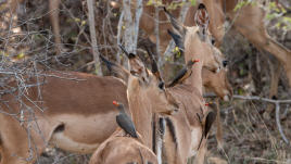 Gegen 5:30 Uhr werde ich von den Baboons (Pavianen) geweckt, die vor unserem Rondavel zu Gange sind. Ich schaue vorsichtig aus dem Fenster und entdecke etliche Baboons, die auf dem Baum herumklettern oder auf der Suche nach Essbarem den Boden inspizieren. Ich ziehe mich an und setze mich auf die Terrasse. Einige Nyalas grasen vor der Türe, eine ganze Herde Impalas zieht vorbei, Baboons streunen durchs Gras und auch unsere "Helmchen" laufen bereits schnatternt vorbei. Walter gesellt sich mit zwei Tassen Kaffee zu mir und gemeinsam genießen wir die Ruhe und die Tiere, die vorbei streifen.