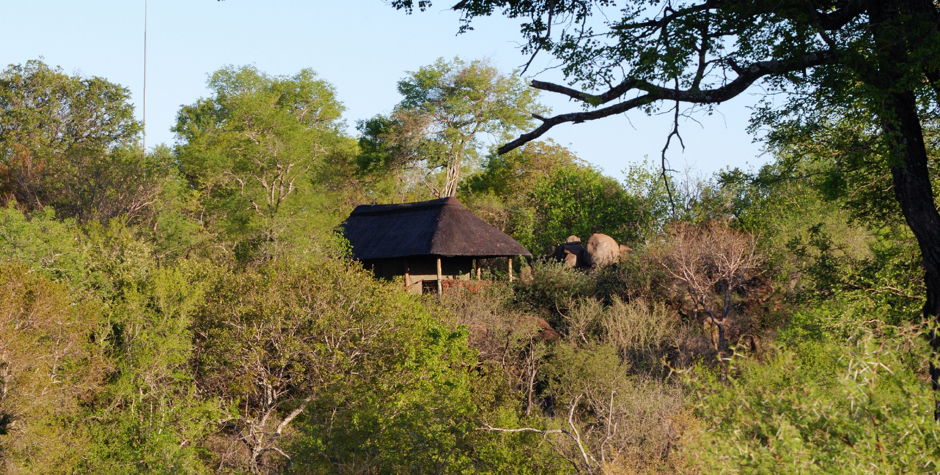 Wir steuern unser erstes Camp Berg-en-Dal an. Schon auf dem Weg dorthin sehen wir am Fluss etliche Krokodile, die träge in der Nachmittagsonne faulenzen. Mal abgesehen von den Impalas, die man ja an jeder „Straßenecke“ trifft ;-), sichten wir schon kurze Zeit später die ersten Elefanten; eine kleine Herde mit Jungtieren. Die Elefanten-Babys laufen immer wieder vor den Autos auf die Straße – ein toller Anblick. Zu guter Letzt entdecken wir 8 Nashörner, die im Dickicht grasen. Na, für die ersten Stunden eine reiche Ausbeute!