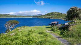Übernachtung: Wunderschöner ruhiger Übernachtungsspot, kleiner Parkpatz am Annascaul Lake, Picknickbank vorhanden, von hier geht ein Wanderweg weiter in Richtung Tal